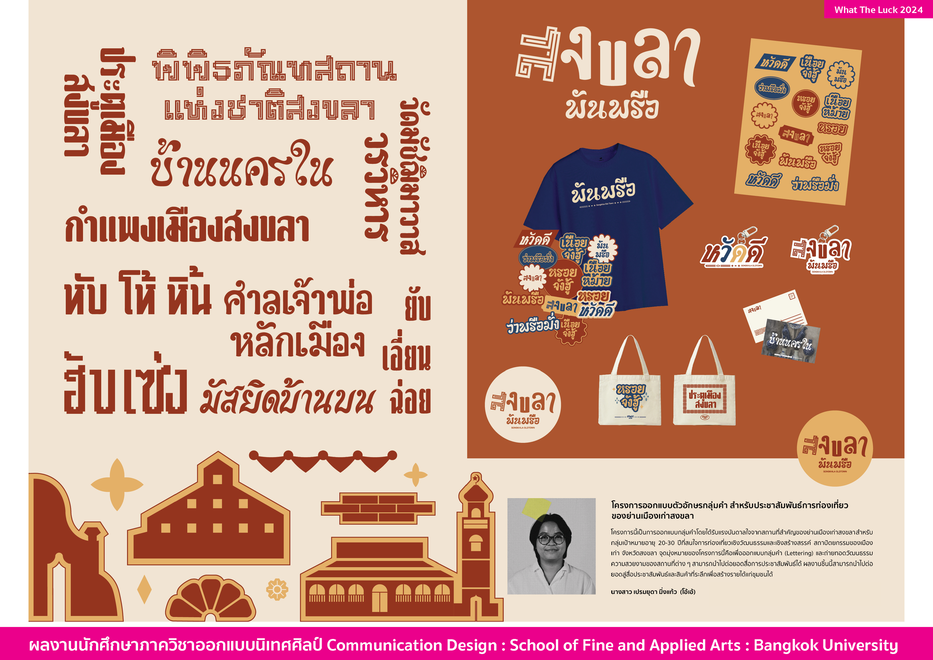 โครงการนี้เป็นการออกแบบกลุ่มค้าโดยได้รับแรงบันดาลใจจากสถานที่สําคัญของย่านเมืองเก่าสงขลาสําาหรับ กลุ่มเป้าหมายอายุ 20-30 ปีที่สนใจการท่องเที่ยวเชิงวัฒนธรรมและเชิงสร้างสรรค์ สถาปัตยกรรมของเมือง เก่า จังหวัดสงขลา จุดมุ่งหมายของโครงการนี้คือเพื่อออกแบบกลุ่มคํา (Lettering) และถ่ายทอดวัฒนธรรม ความสวยงามของสถานที่ต่าง ๆ สามารถนําไปต่อยอดสื่อการประชาสัมพันธ์ได้ ผลงานชิ้นนี้สามารถนําไปต่อ ยอดสู่สื่อประชาสัมพันธ์และสินค้าที่ระลึกเพื่อสร้างรายได้แก่ชุมชนได้